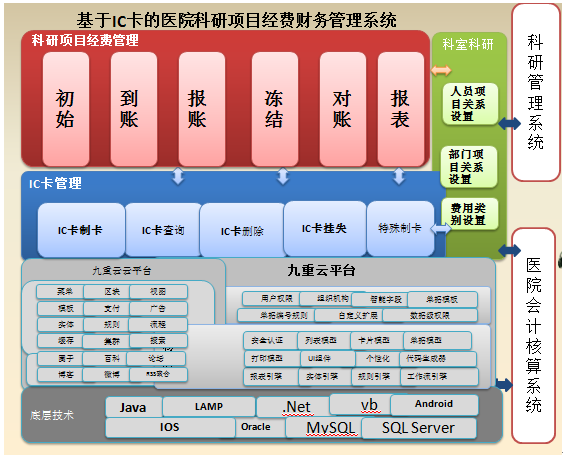 九重云公司基于9clouds平臺,提供具備先進(jìn)的B/S架構和java技術(shù)來(lái)搭建基于IC卡的醫院科研項目經(jīng)費財務(wù)管理系統,支持Windows平臺+Oracle數據庫。IC卡醫院科研項目經(jīng)費管理系統架構如下